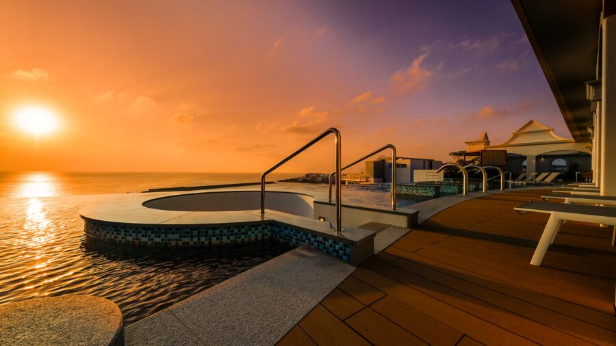 8F最上階には地下1400mから汲み上げた天然温泉の大浴場を完備しており。「沖縄で一番夕日がきれいに見える場所」と言われるこのロケーションでは、空と海が溶け合うような絶景をお楽しみいただけます