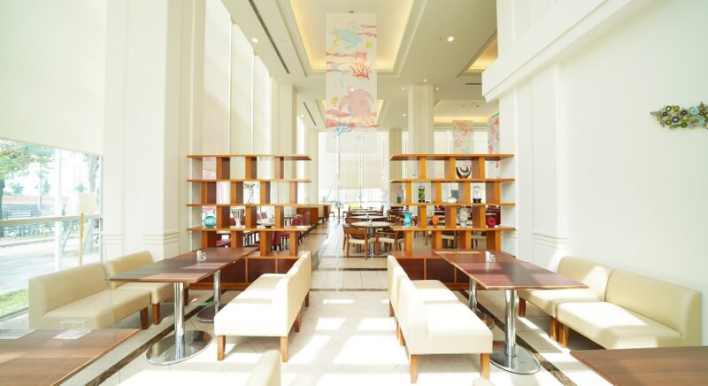 天井が高く開放的な空間のレストランにて魅力的な沖縄の食材を使用した料理を提供しています。