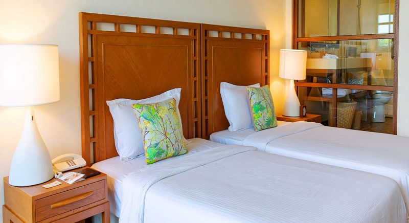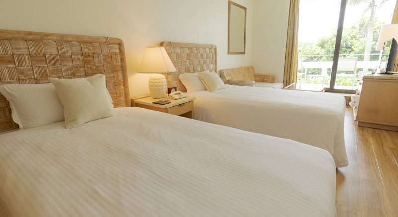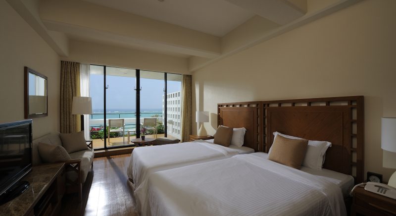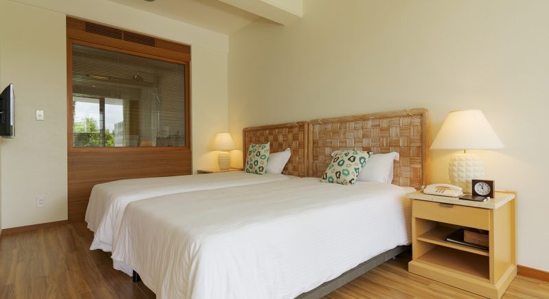 白を基調とした明るい3タイプのお部屋をご用意。窓の外にはガーデンの緑や港など、恩納村ののどかな風景が広がります。