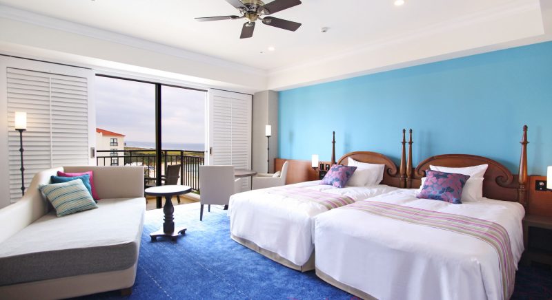 沖縄の青い海と空、白砂のビーチをイメージした中に読谷村の村花ブーゲンビレアの色彩が調和した客室です。