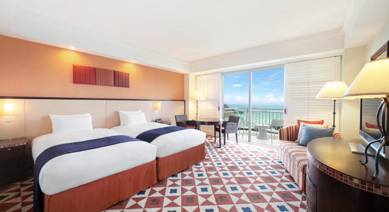 沖縄の眩しい太陽とスペインの鮮やかなタイル使いからインスピレーションを受けた、明るく華やいだ色合いの客室です。