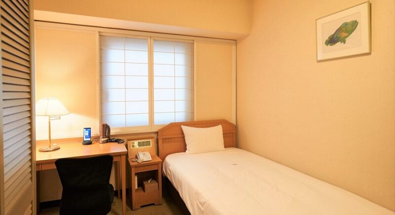 ベッド幅は110cmでご用意。シンプルなインテリアを機能的に配しております。快適な滞在をお楽しみください。