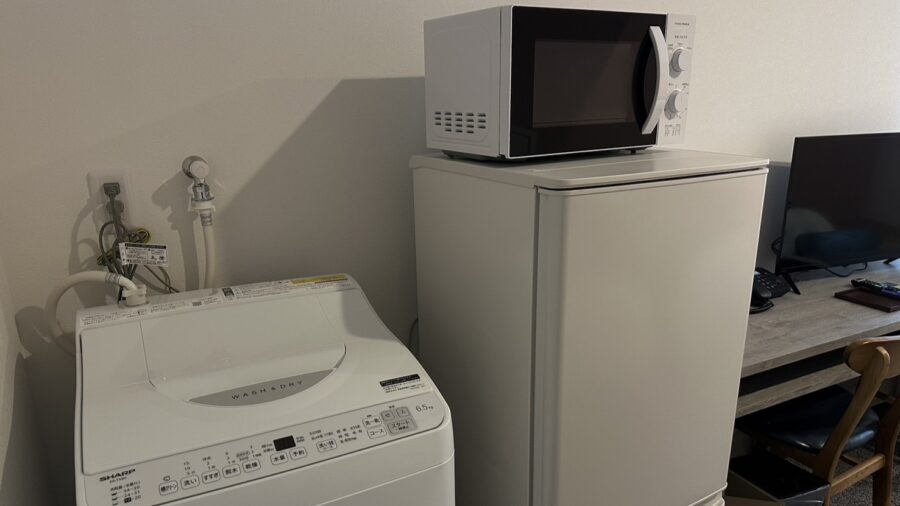 ベッドサイズ120㎝。全室に洗濯機・電子レンジ・冷凍冷蔵庫完備