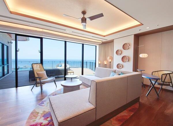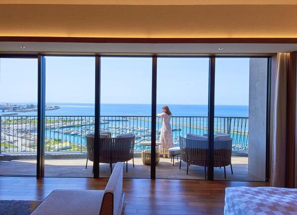 ホテル最上階に位置する70㎡のテラスを備えた解放感あふれる客室。遮るもののない絶景と海風(ウミカジ)を心ゆくまでご堪能ください。