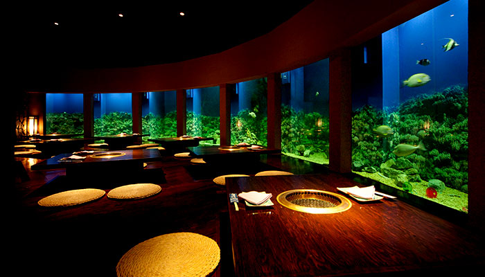 炭火で焼く厳選された食材と、沖縄の郷土料理や競りから届く活海鮮、沖縄全島から選りすぐった泡盛と、光、影、蒼の空間が南国の夜を炭火焼で気軽にご堪能ください。