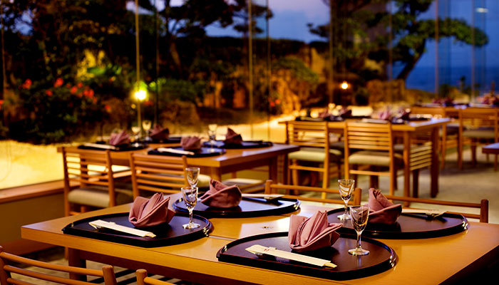 東シナ海を一望するエレガントなレストラン。きめ細かなサービスでもてなすひとときは、リゾートの夜を素敵に演出。