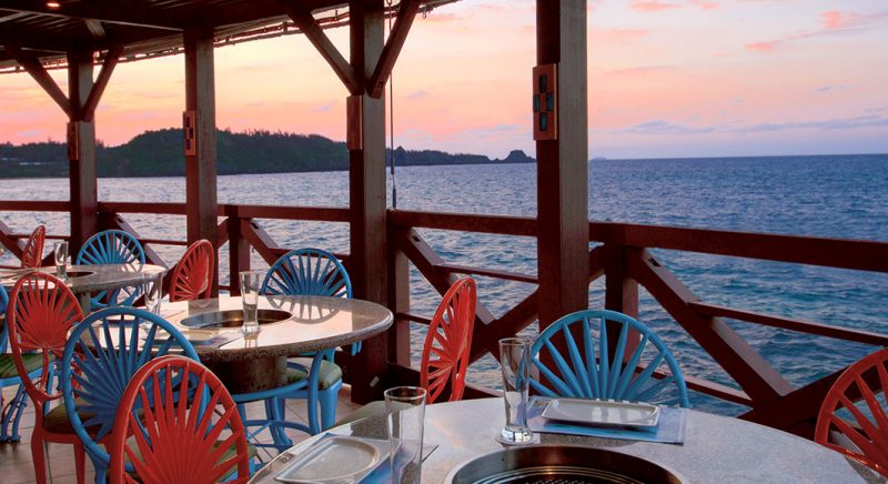 珊瑚礁に浮かぶレストランで、夕陽とともに味わうバーベキューは格別。ジューシーなUSビーフやサーモンなど新鮮な魚介を楽しむバーベキューを満喫。