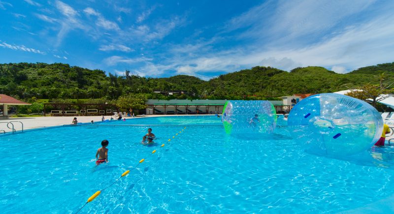 アウトドアプールには大型日除けを設置し、沖縄の強い日差しを気にせず遊べます。またアウトドア、インドアともに、水深50cmの子供用プールと高さ5mのウォータースライダーを併設。