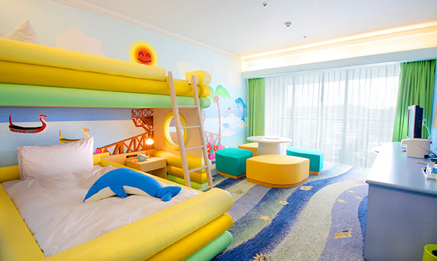 内ドアで行き来できる、ファミリーに人気のコネクティングルームです。カラーやデザインが異なる4タイプの客室があり、お子様用のパジャマやステップなどはもちろん、小学生以下のお子様にはフリッパーズバッグもご用意しています。