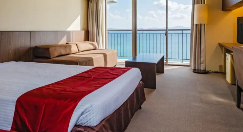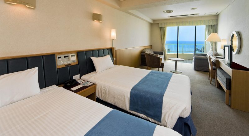 全室オーシャンビューのお部屋で、バルコニーからはエメラルドグリーンの海はもちろん、天気のよい日はサンセットがご覧いただけます。
