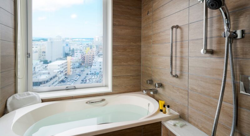 エキストラベッドを1台配置可能、最大3名様1室にてご利用いただけます。バスルームを窓側に配置し、那覇の夜景を堪能するバスタイムをどうぞ。