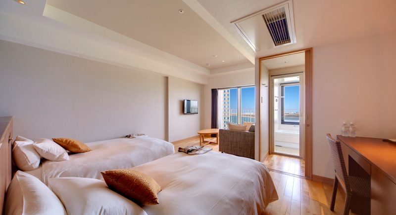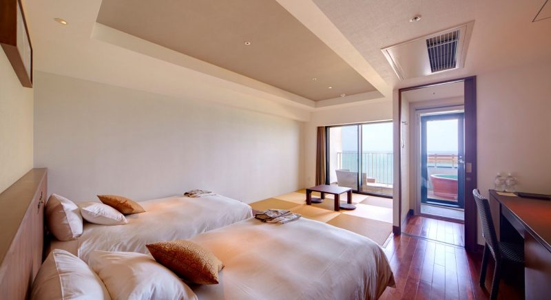 琉球温泉瀬長島ホテルの客室露天風呂付和洋室は全室オーシャンビューとなっており、窓の外に広がる鮮やかな東シナ海をご覧頂けます。