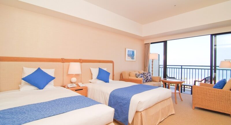 ナチュラルトーンと青い空と海が調和した開放感溢れる室内。籐の椅子ホテル3F~5F・オーシャンビュー(海側の景色)のスタンダードルーム