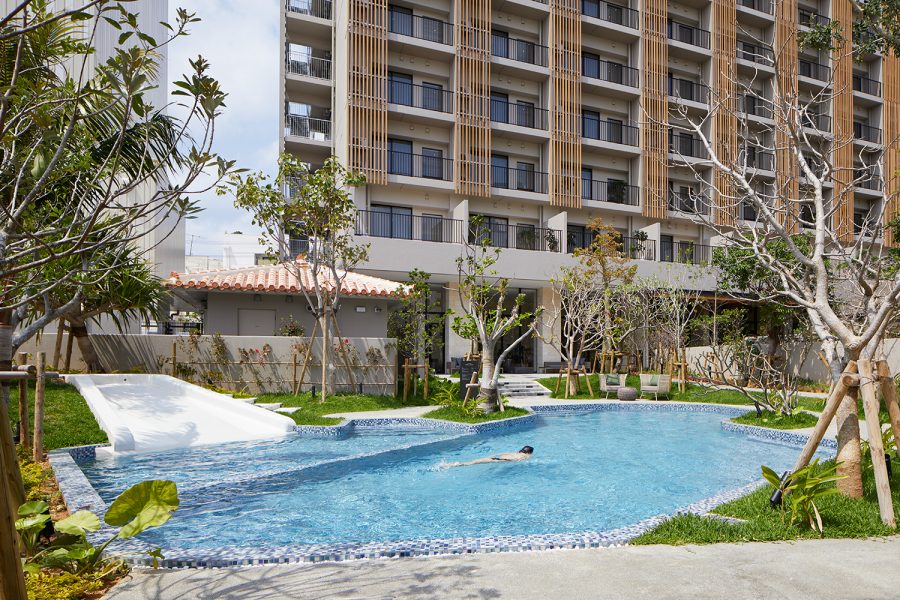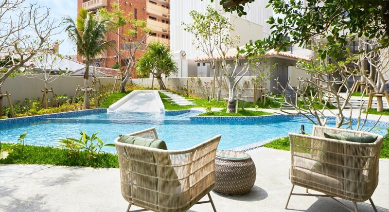 琉球の森をイメージした緑豊かな中庭には全長約14mの屋外プールと子ども用プールを設けています。屋外プール:8:00 - 22:00