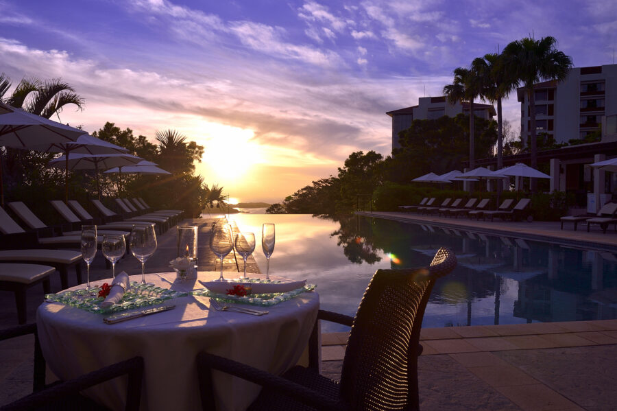 森から西の海へと向かって開かれたウォーターフロースタイルの屋外プール。プールサイドでは「ライブラリーラウンジ&バー」からライトミールやカクテルなどのオーダーもお楽しみいただけます。