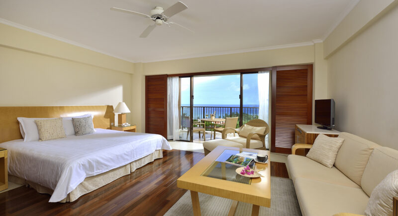 森に向かって開かれた窓からはなだらかな稜線を描く恩納岳や青く広がる東シナ海が望める贅沢なレイアウト。広さ 部屋タイプ 定員 57m² ラグジュアリー ツイン 1~2