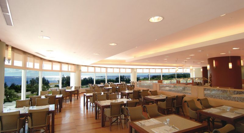 10、11、12階のエグゼクティブフロアにご宿泊のお客様がご利用いただける落ち着いた雰囲気のラウンジ。ホテル最上階の13階に位置し、窓の向こうには広い空と残波の青い海が広がり、雄大な沖縄の自然を感じられます。沖縄の美しい海や絶景スポットとされる残波岬の夕陽を望むことができ、時間帯に合わせて提供するメニューとともに特別なひとときをお過ごしください。