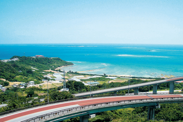 海に向かって大きくカーブを描く全長660m、高さ80mのニライカナイ橋。橋を下る手前、トンネルの上は見晴らしのいい展望になっていて絶好の撮影スポットです。