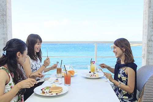 青い海と古宇利大橋を一望する展望タワーに、シェルミュージアム。レストランやショップなどもあり、古宇利島名産のカボチャをはじめとした沖縄県産の食材を使った料理やお菓子を味わうこともできます。