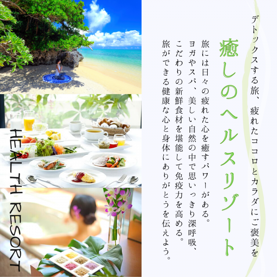 心身共に疲れた体を自然のエネルギーからパワーチャージ。ヨガやフィットネスジム、プールで身体を動かし、夕陽の見える半露天風呂(有料)で1日の終わりにゆっくり寛ぐ。健康にこだわった新鮮な地元食材を使ったメニューを堪能し、窓の向こうに見える美しい景色を眺めながら心地よい「沖縄日和」をお過ごしいただけます。