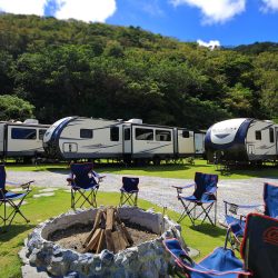 世界遺産の今帰仁城跡から車で3分のところに位置するTAMARUは大自然に囲まれたキャンプ場。キャンピングトレーラー内には専用シャワーやトイレも付いており、冷蔵庫、電子レンジ、湯沸かしポットなども完備。