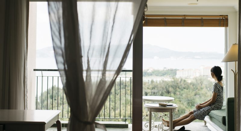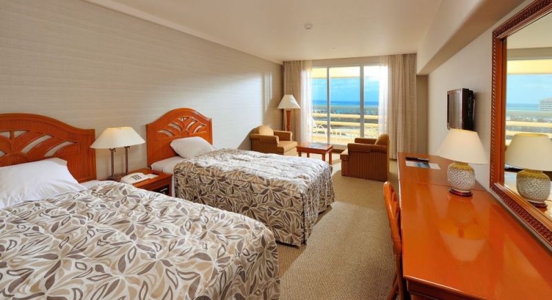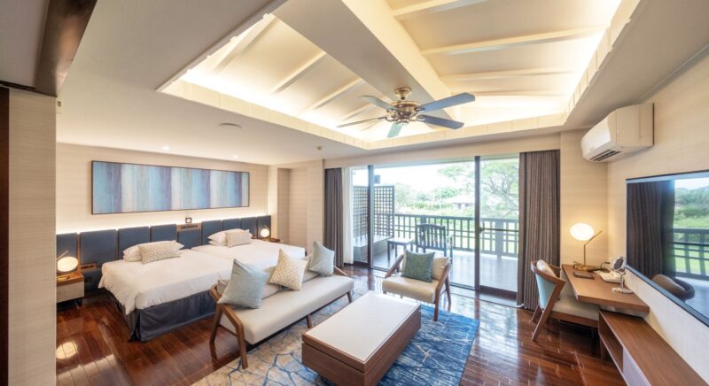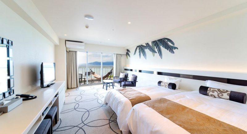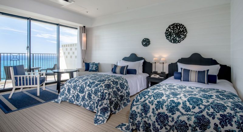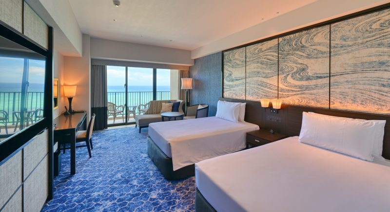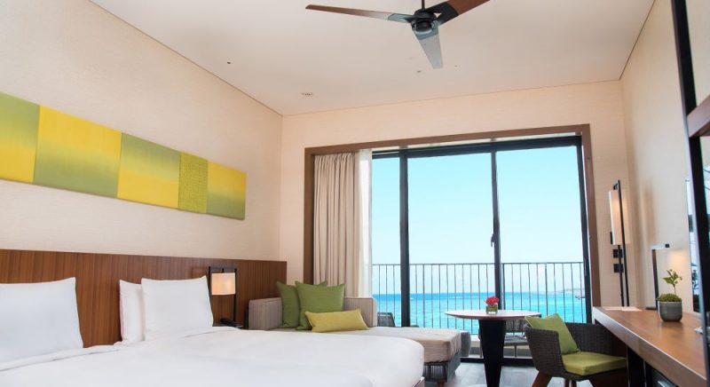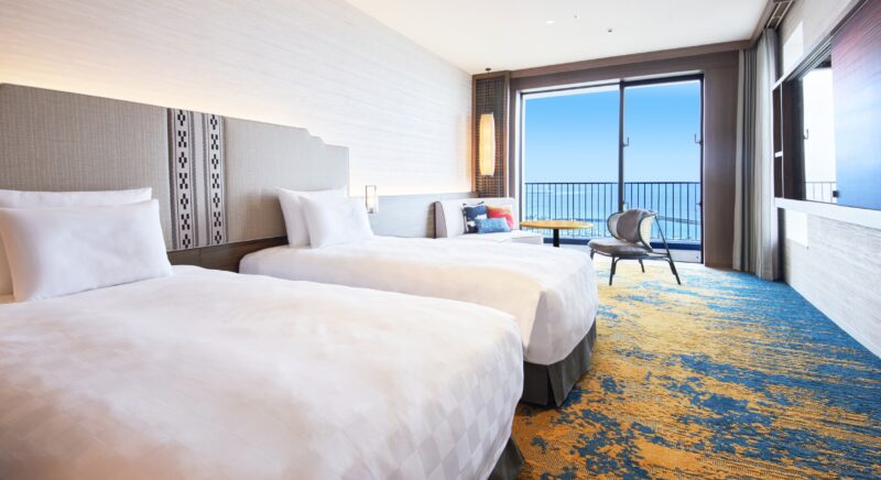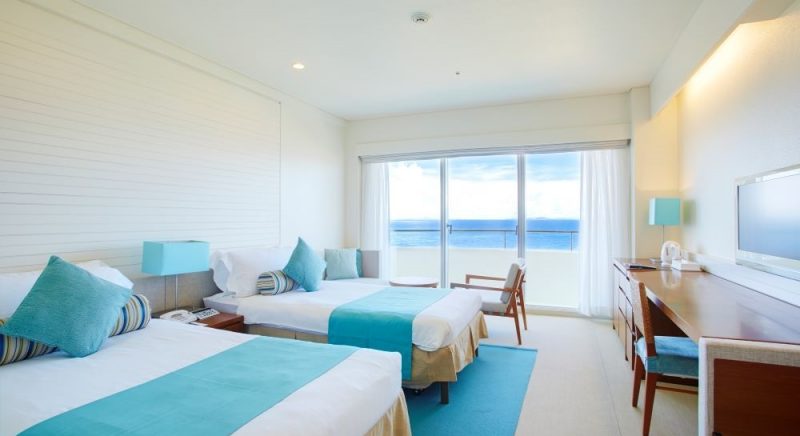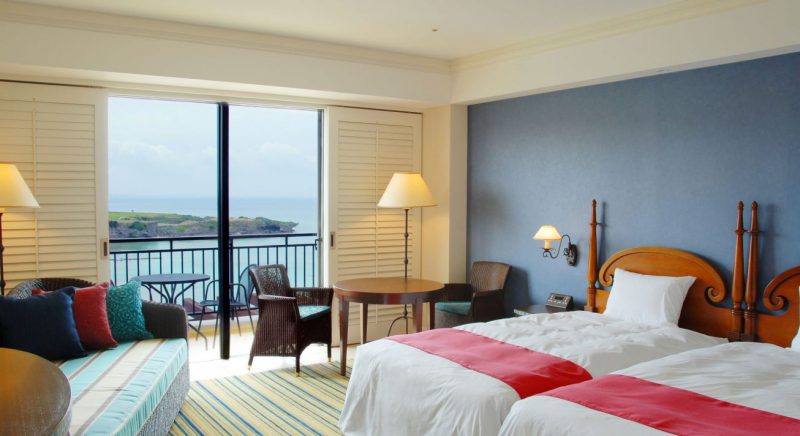 ゲストルームの中に居ながら南国沖縄の元気な太陽を浴びた木々や東シナ海の美しいオキナワンブルーのグラデーションを堪能