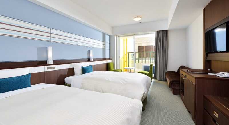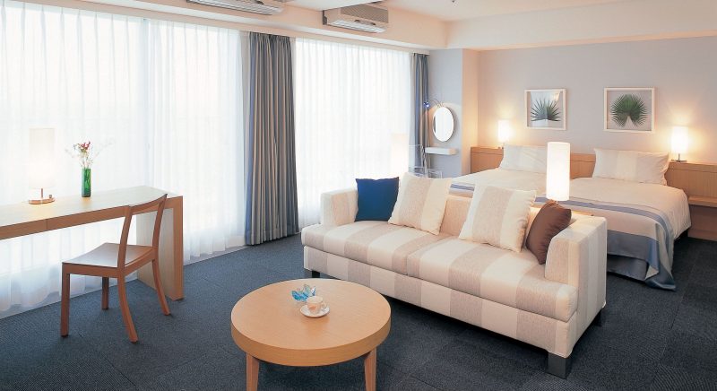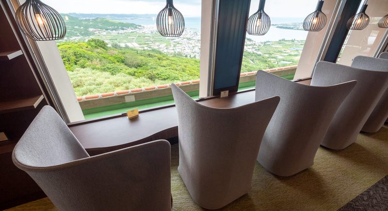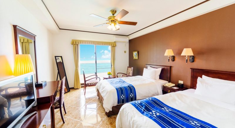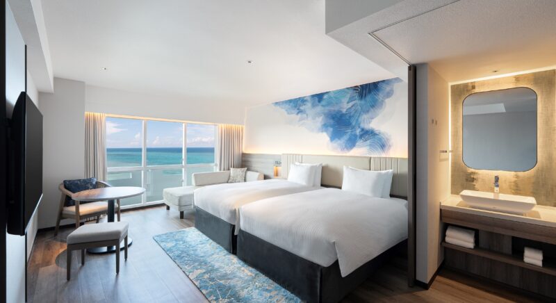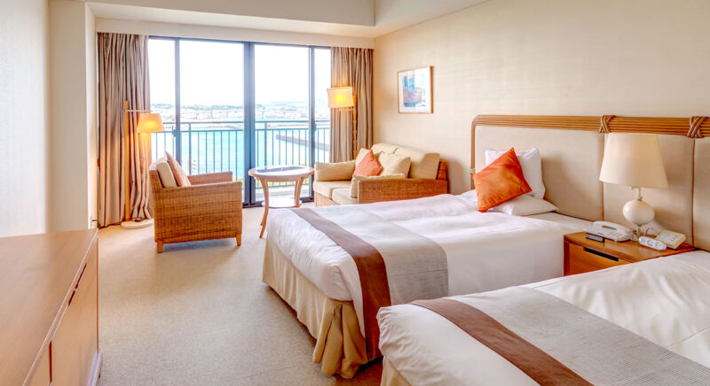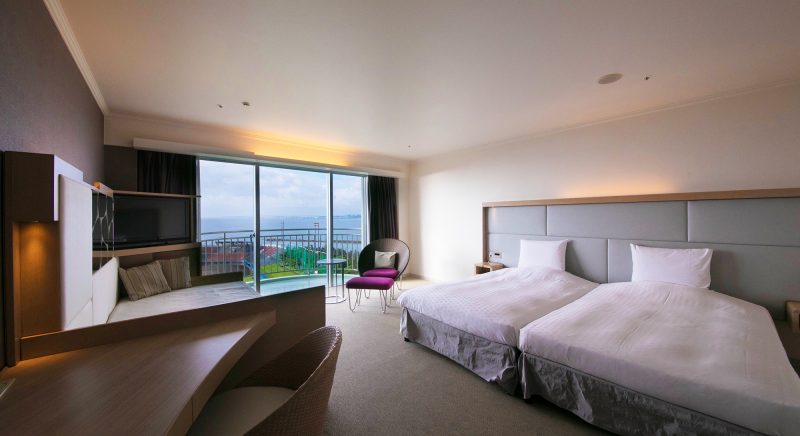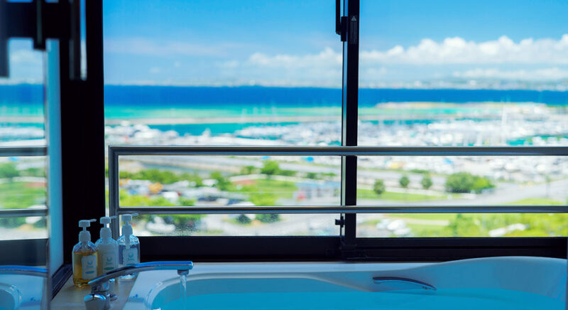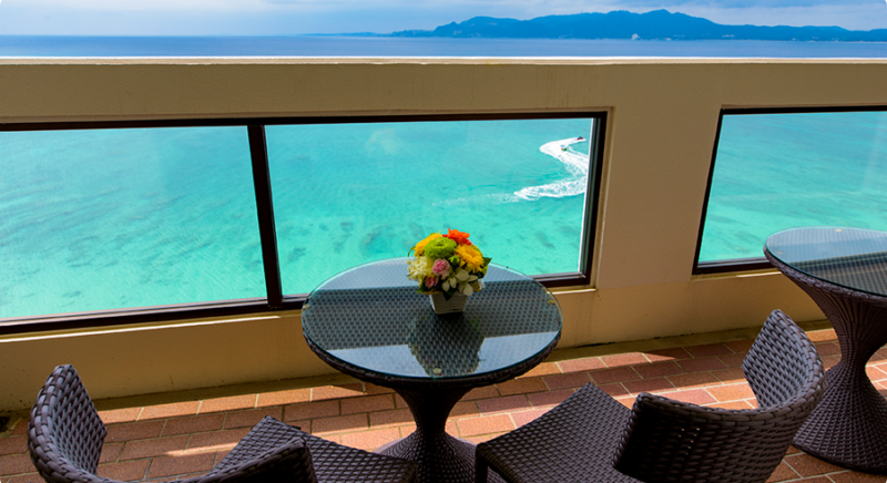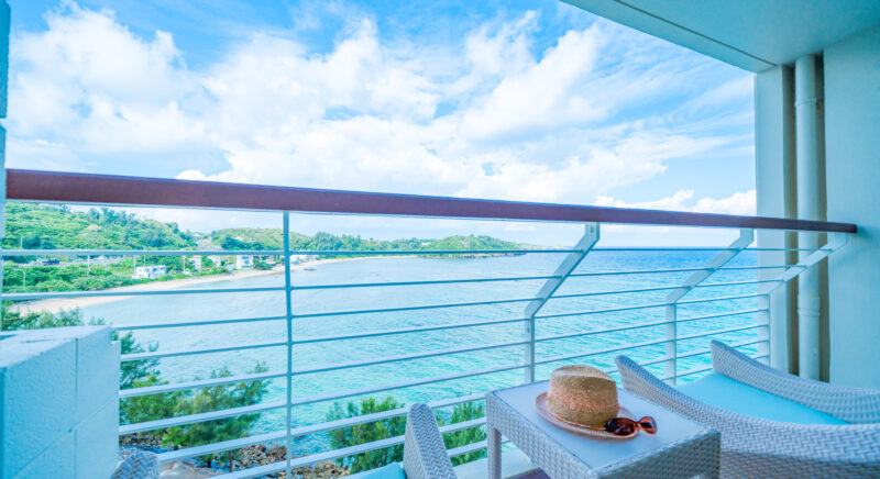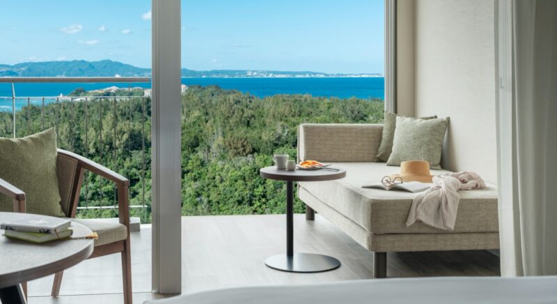 ゲストルームの中に居ながら南国沖縄の元気な太陽を浴びた木々や東シナ海の美しいオキナワンブルーのグラデーションを堪能