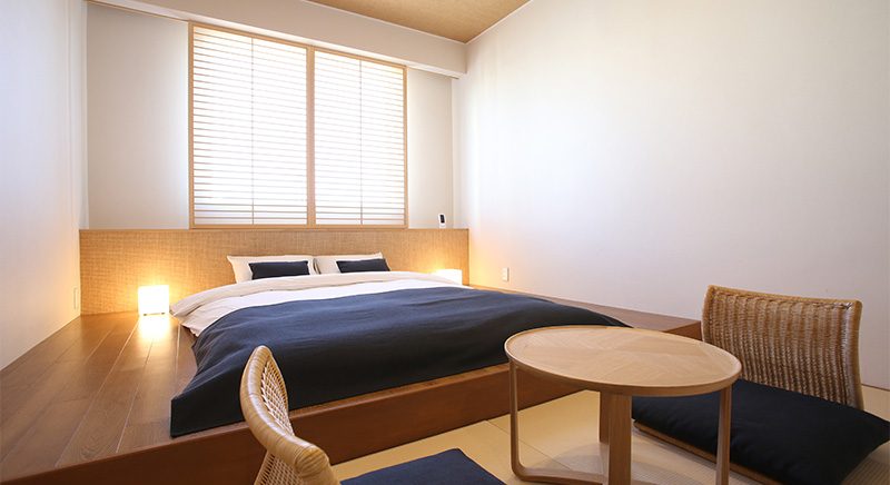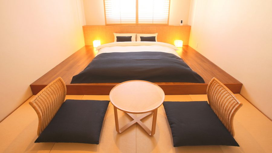 畳間と一段小上がりの床の間にベッド用マットレスをセットした和モダンタイプの客室タイプです。