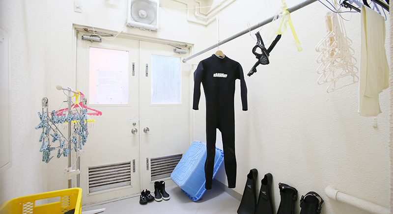 ダイビング器材やシュノーケルセット等を干すことができる乾燥室をご用意しております(室内)。また、屋外には器材の洗い場もございます。