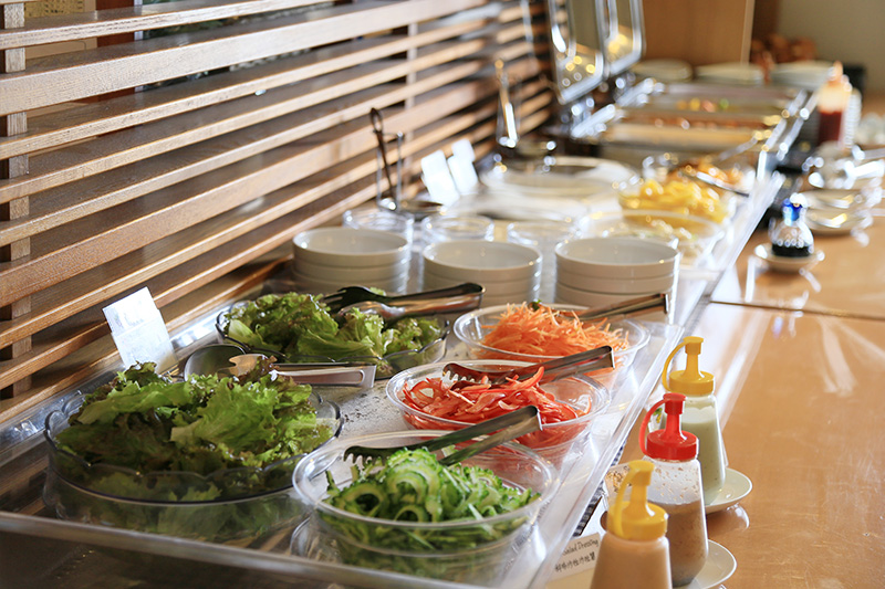 サラダ・パン・スープ(日替り)・お粥・味噌汁・ドリンクなどがバイキングスタイルとなり、 メインのおかずとなるホットプレートとデザートはお客様の来店と合わせてご提供します。