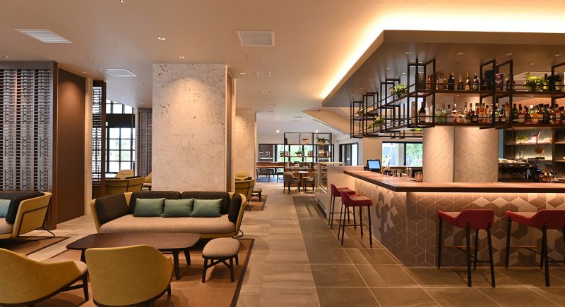 島食材のメニューやコーヒーが楽しめるリゾートラウンジ。落ち着いた雰囲気の中のバータイムも