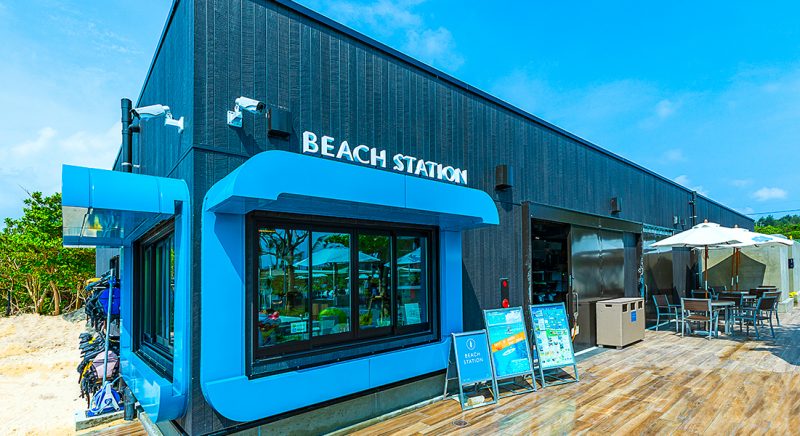 ビーチ⽤品の貸出や、各種マリンスポーツ、レジャーに関する問い合わせやご予約などの総合受付を担うビーチステーション。