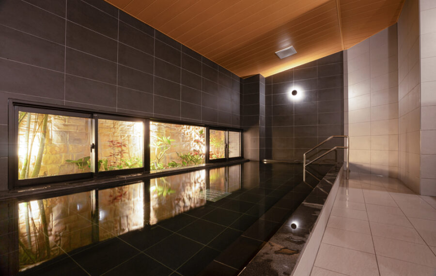 ゆったりとくつろげる大きな浴槽は、坪庭に植えられた八重山諸島に生息する豊かな木々が照らし出され、幻想的な雰囲気。じんわりと汗をかいてリフレッシュできるミストサウナを併設。
