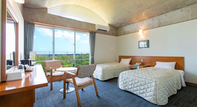 島一番の高地「黄金山(こがねやま)」に立つ宿泊施設であり、洗練されたデザインと行き届いた設備、フロント、中庭、客室と、どこも存分に空間があります。自然光をうまく取り入れた設計は、旅の疲れを癒すだけではなく、ここにいるだけで安らぎを感じます。