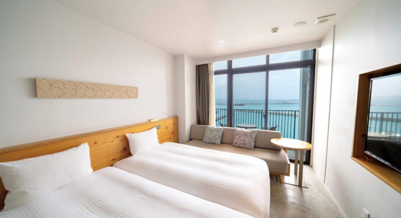 スタンダードツインは、オーシャンビューに向けたテラス、W1100×2のベッドをご用意しています。大きなソファはベッドにもなり、グループやファミリーなど最大3名まで対応しております。