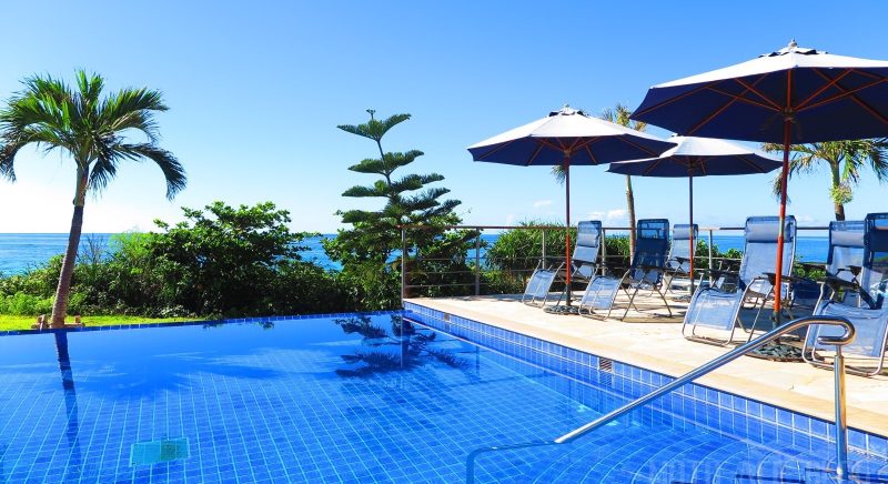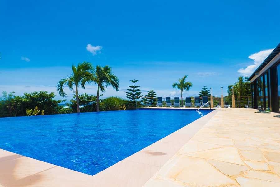 南国の陽ざしのなか、芝グリーンと宮古ブルーの景色をプールから、どなた様もお楽しみいただけます。