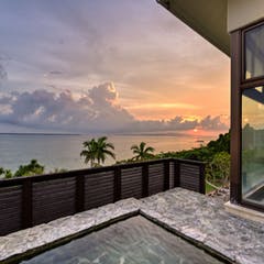 当館7室、最上階。大胆に配置されたバスタブから望むダイナミックな景色。部屋から見下ろせるコバルトブルーの海は、八重山の珊瑚礁が作り出す美しいグラデーションがかかり、非日常的でうっとりするような空間を味わうことができます。