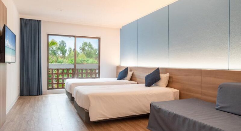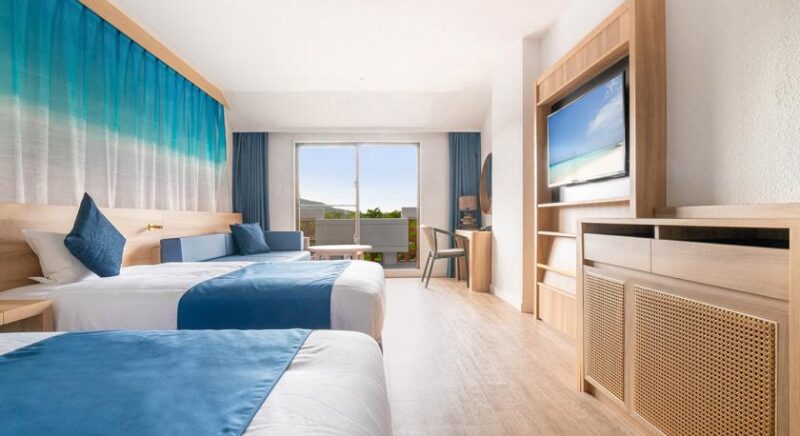 久米島の『海』をイメージしたデザインの客室。バルコニーからプールが見え、抜群の解放感を満喫できる。