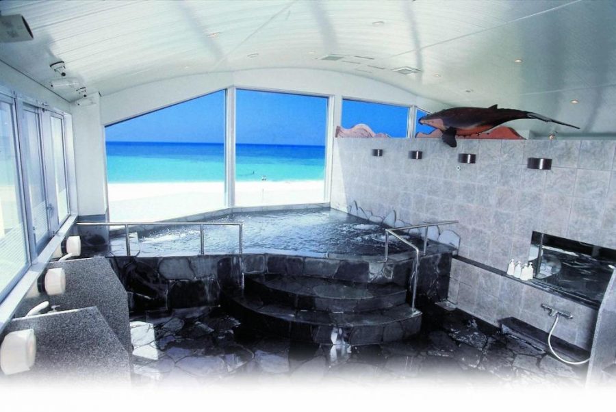 久米島の海の恵み、海洋深層水を利用した展望風呂。ミネラル成分たっぷりのお風呂です。