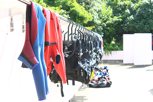 3つの水槽と、100名分干せる広い洗い場。大事なダイビング器材をしっかり洗えます。
