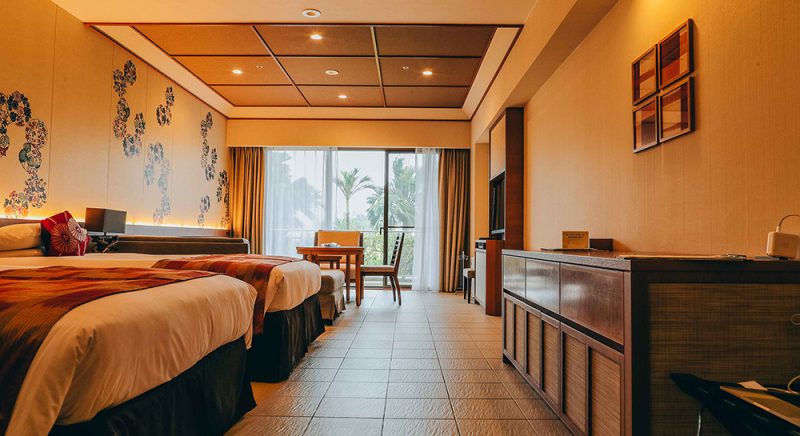 ツインルームの奥に広々としたスペースがありご家族やグループでゆったり過ごせます。 紅型が装飾され、お部屋で寛ぎながら沖縄を感じられるのが魅力です。