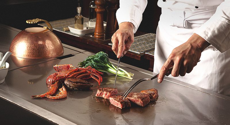 シェフが鮮やかな手さばきで調理する、高級感漂う鉄板焼。 美味しいワインや泡盛を傾けながら、シェフとの会話も弾みます。(やえびし内)