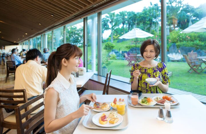素材や郷土の味にこだわった、島素材あふれる約50種類の朝ごはんをブッフェ形式で通年お愉しみいただけます。焼き立てクロワッサンや、自分で入れられるブルーシールのソフトクリームがひそかな人気。朝からパワーをチャージ