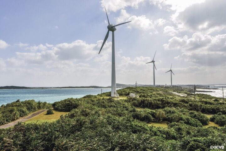 宮古本島の最西端であるとともに最北端にもあたる西平安名崎。左に伊良部島(いらぶじま)、右に池間島と池間大橋を一望できる雄大なパノラマは、東平安名崎とは対照的な穏やかな景色が広がっています。また、エネトピア構想の一環である風力発電の大きな風車がいくつも建ち並び、その独特の景観は西平安名崎のシンボルにもなっています。