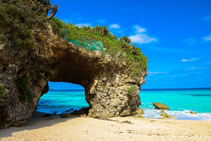 砂山ビーチはパウダースノーのような白い砂丘をのぼりきると、コバルトブルーの海が広がっています。アーチ状の岩が特徴的で、きめ細やかな白い砂と青い海のコントラストは絵画のような美しさ。景色を楽しんだり写真撮影するのにぴったりのビーチです。