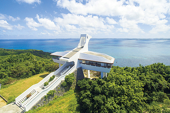 伊良部島(いらぶじま)で最も高い場所にあるのが、町のシンボル「サシバ」が羽を広げて飛んでいる姿を模した牧山展望台です。ここからは東側に宮古本島、来間島(くりまじま)、池間島が見渡せ、美しい海や真っ青な空が一面に広がっています。