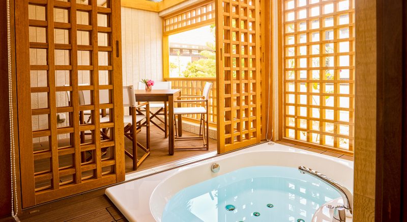 客室はコテージタイプで、全室ロフト付の遊び心いっぱいの明るい空間。テラスにはジャグジーバスがあり、別荘感覚でゆったりと過ごせます。