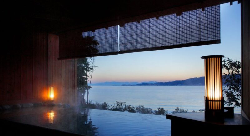 朝日に輝く海、漆黒の夜に浮かび上がる大鳥居、行き交う船影。湯船に身を委ね、刻々と移りゆく絶景をお楽しみください。※事前予約制/料金3,800円(税込)/45分