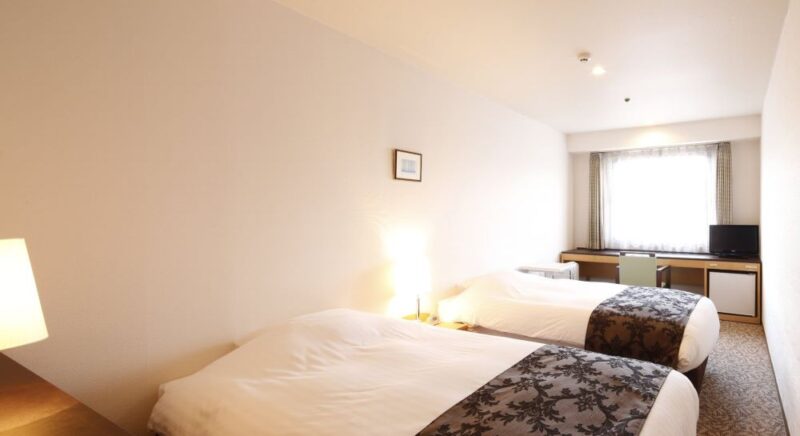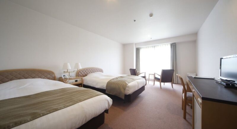 山側の広めのツインルーム。落ち着いた空間でゆったりとお過ごしいただけます。