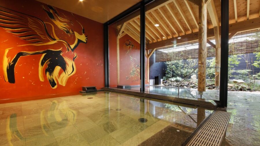 肩までしっかりつかれる浴槽、男女それぞれに個性的な庭を設えた露天風呂、日本の伝統色を取り入れたアート左官の壁とそこに描かれた大壁画など「最古にして最新」を謳(うた)う道後ならではの温泉で、心も体ものびのびゆったり癒やして下さい。